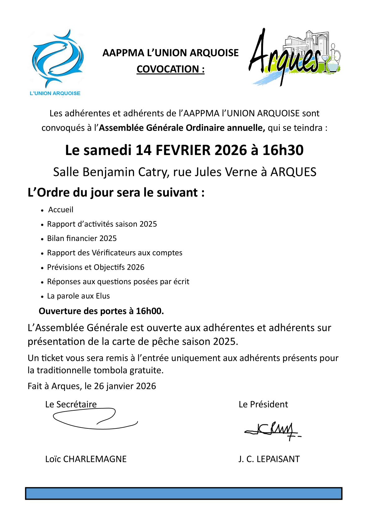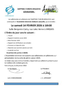L’assemblée générale ordinaire 2025 de l’AAPPMA l’UNION ARQUOISE aura lieux le samedi 14 février 2026.